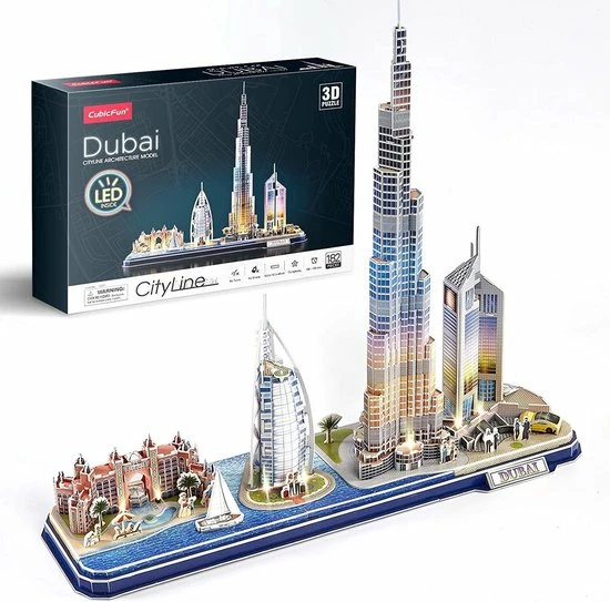 【Verken Dubai Cityline Model Model Verken in deze glorieuze lichtstad verschillende beroemde gebouwen in deze stad, waaronder het Atlantis the Palm Dubai, het 7-sterrenhotel Burj Al Arab Jumeirah, Burj Khalifa, Emirates Towers. Maak met de kinderen kennis met beroemde gebouwen en bezienswaardigheden.