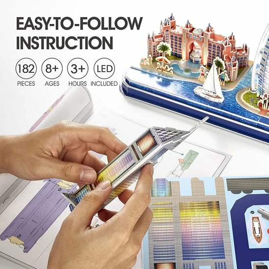 【Premium kwaliteit】 Gemaakt van papier en stevig gelamineerd schuimmateriaal, met de afbeeldingen scherp bedrukt. De set wordt geleverd met een boekje in tijdschriftstijl met duidelijke instructies, goede foto’s en feiten over Dubai. U kunt op elk moment genieten van het nachtelijke uitzicht op Architecture Dubai Skyline. Onze kabels en puntlampen zijn klein genoeg om tussen de puzzels te verstoppen. 2 × AA 1.5V-batterij nodig (niet inbegrepen).
