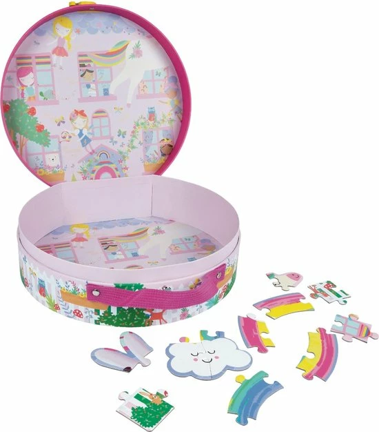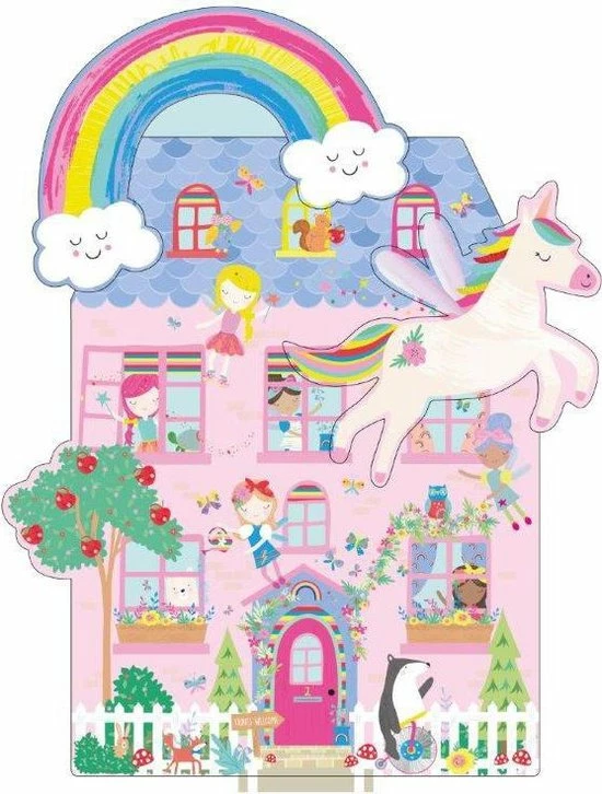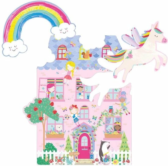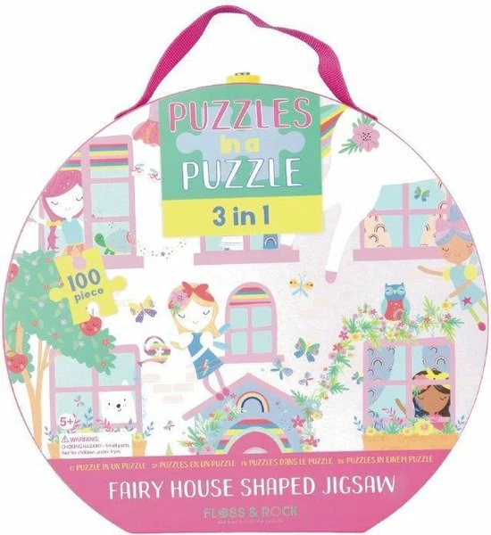 Floss & Rock 3-in-1 Puzzel, Fairy. Deze leuke puzzels kan je apart maken, maar samen vormen ze 1 geheel! De regenboog en de eenhoorn bestaan elk uit 12 stukjes en het schattige huisje uit 76 stukjes. De puzzel is een uitdaging voor de allerkleinsten. Wij raden daarom aan deze puzzel te laten doen door kinderen vanaf 5 jaar. De puzzel wordt in een leuk koffertje met handvat geleverd. Een fantastisch cadeau voor de fanatieke puzzelaars.