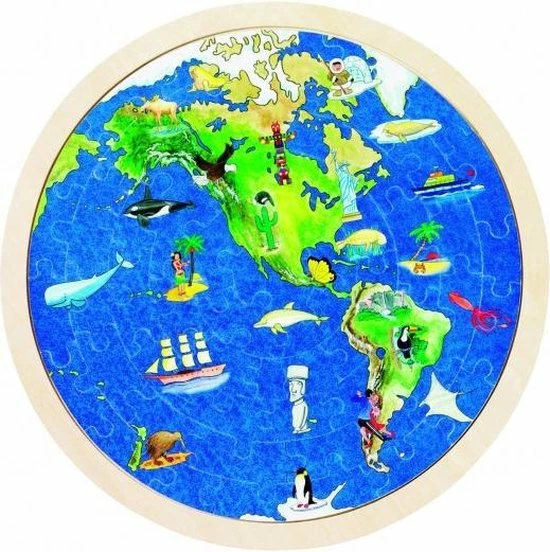 Goki Wereldbol legpuzzel Puzzel uw eigen wereldbol bij elkaar! De puzzel is een 57-delige houten dubbelzijdige wereldbol. Met aan 1 zijde Europa, Afrika, Azië en Oceanië. Aan de andere zijde Noord-, Midden en Zuid Amerika. Verder is de wereldbol gevuld met leuke illustraties. Specificaties: Kleur: multicolor Geslacht: unisex Materiaal: hout Diameter: 30 cm Aantal stukjes: 57 stukjes Inhoud: 57 Stukjes