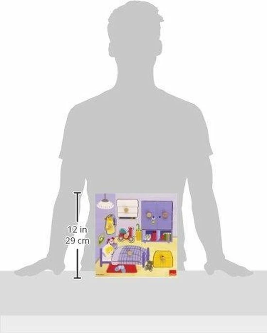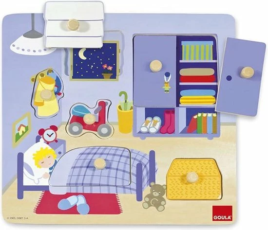 Mooie houten knopjes puzzel van Goula van 7 stukjes met afbeeldingen van herkenbare voorwerpen uit de kinderkamer. Lukt het jou om de puzzelstukjes op de juiste plek te plaatsen? Deze houten puzzel van Goula is uitstekend geschikt voor de allerkleinste handjes.