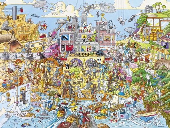 Hollworld is een puzzel waarop je allerlei verschillende filmsets ziet van Hollywood. Welke herken jij allemaal? Door alle gebeurtenissen op de puzzle, heb je genoeg te bekijken! Artiest Schöne. Deze puzzel wordt geleverd is een mooie driehoekige doos.