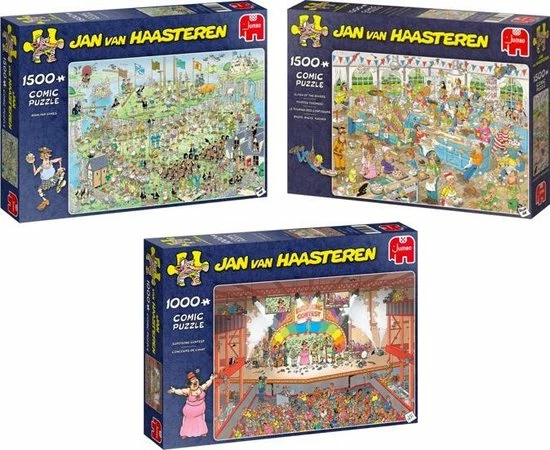 Jan van Haasteren tekent al decennia lang humoristische, kleurrijke platen met veel detail. De doorgewinterde fan zoekt in elke puzzel direct naar de haaienvin, hét handelsmerk van Jan. Om aan de grote vraag naar Jan van Haasteren puzzels te voldoen, wordt er ook getekend door ‘Jan van Haateren studio’ tekenaars. Samen met Jan werken deze tekenaars aan nieuwe dolkomische platen. In de Jumbo collectie vind je tientallen Jan van Haasteren puzzels van 150 tot 3000 stukjes. Heel veel puzzelplezier!