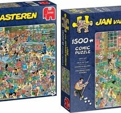 Jan van Haasteren tekent al decennia lang humoristische, kleurrijke platen met veel detail. De doorgewinterde fan zoekt in elke puzzel direct naar de haaienvin, hét handelsmerk van Jan. Om aan de grote vraag naar Jan van Haasteren puzzels te voldoen, wordt er ook getekend door ‘Jan van Haateren studio’ tekenaars. Samen met Jan werken deze tekenaars aan nieuwe dolkomische platen. In de Jumbo collectie vind je tientallen Jan van Haasteren puzzels van 150 tot 3000 stukjes. Heel veel puzzelplezier!