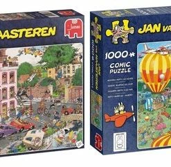 Jan van Haasteren tekent al decennia lang humoristische, kleurrijke platen met veel detail. De doorgewinterde fan zoekt in elke puzzel direct naar de haaienvin, hét handelsmerk van Jan. Om aan de grote vraag naar Jan van Haasteren puzzels te voldoen, wordt er ook getekend door ‘Jan van Haateren studio’ tekenaars. Samen met Jan werken deze tekenaars aan nieuwe dolkomische platen. In de Jumbo collectie vind je tientallen Jan van Haasteren puzzels van 150 tot 3000 stukjes. Heel veel puzzelplezier!