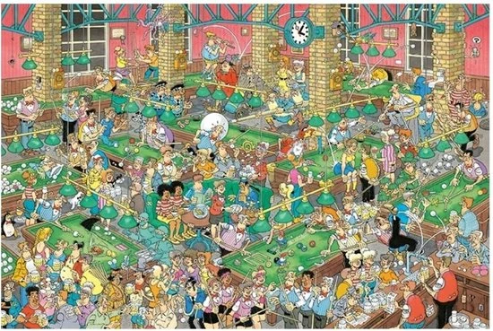 Een hilarische Jan van Haasteren puzzel met de meest chaotische poolbar die je ooit hebt gezien. Niks is gek genoeg voor de Jan van Haasteren puzzels en ook deze puzzel met 1500 stukjes bevat de meest unieke details. Elk hoekje heeft haar eigen detail en maakt deze puzzels super leuk om in elkaar te leggen. Voor een goed potje poolen zit je verkeerd, maar om lachend een puzzel in elkaar te leggen zit je precies goed.