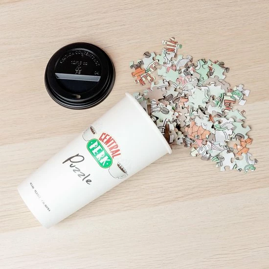 Central Perk koffiebeker puzzel van Friends. Legpuzzel bestaande uit vierhonderd stukjes, met Central Perk design. De puzzel zit verpakt in een Central Perk koffiebeker. Bevat tekeningen van het Central Perk logo, koffiebonen en de bekende bank. Voor de echte Friends fan. Dit is een officieel gelicenseerd Friends product.