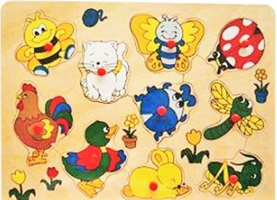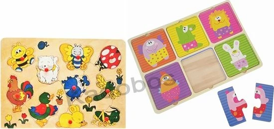 1x houten noppen puzzel 10 dieren en 1x 6 jonge dieren met 2 stukken