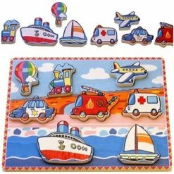 De houten figuurtjes in deze voertuigenpuzzel zijn zo dik, dat er geen knopje op hoeft om ze beet te pakken. Je kunt ze natuurlijk recht op zetten om mee te spelen Ze passen alle 8 in het stevige houten puzzelframe.