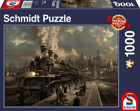 Puzzel van een prachtige oude stoomlocomotief in de sfeer van rond jaartal 1850. Heren met hoge hoeden op het perron, dames in lange rokken en de stad op de achtergrond. Puzzel bevat 1000 stukjes, leeftijd vanaf 12 jaar.