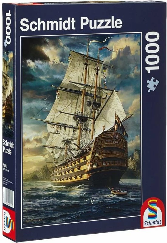 Puzzel van een 17e eeuws zeilschip op zee, waarboven zich donderwolken verzamelen. Zeer bijzondere details zijn te zien, zoals een sloep met bemanning die het schip nadert en de reeks vlaggen in de mast van het schip. Puzzel bevat 1000 stukjes, leeftijd vanaf 12 jaar.
