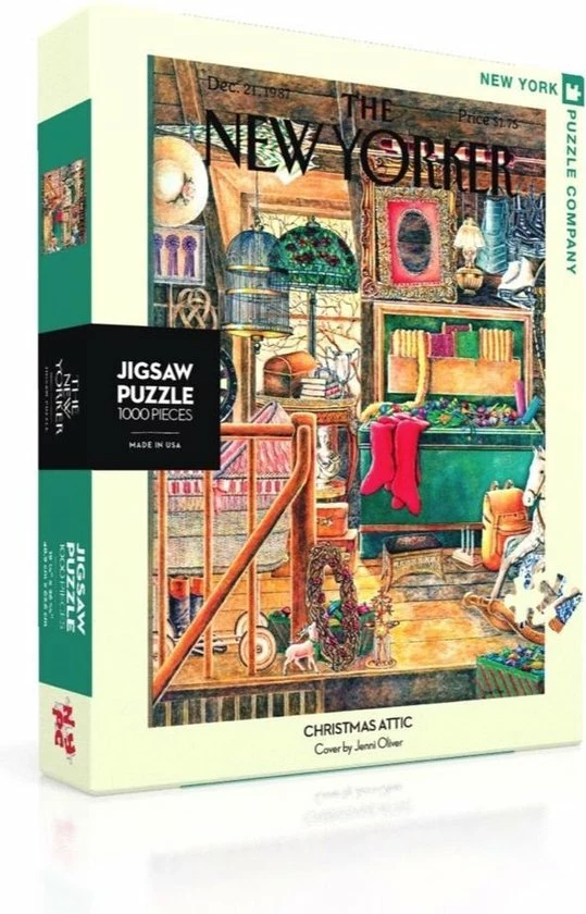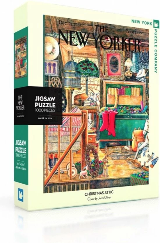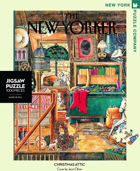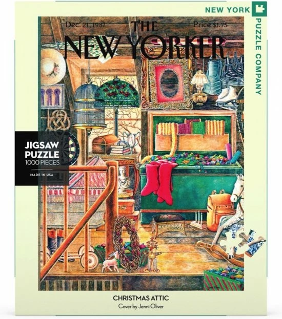 Het was de week voor Kerstmis en de spullen die op zolder staan zijn weer klaar om op te duiken om een feestelijke sfeer te creëren. Schaatsen hangen klaar voor een winters uitje, terwijl opgeborgen kousen geduldig wachten om opgehangen te worden een de schouw. Binnenkort sieren versieringen de boom en de krans van vorig jaar is klaar om op te hangen. Kortom, met deze puzzel van New York Puzzle Company kom je zeker in de kerstsfeer! De puzzel heeft 1000 stukjes en heeft een linnen stijl afwerking zodat de puzzel minder glimt. Aanbevolen leeftijd: 13+ jaar.