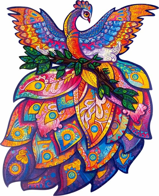 Deze houten puzzel van UNIDRAGON is een leuke bezigheid voor het hele gezin. In een ver land in het Verre Oosten is er een magische tuin waar de meest fantastische wezens te vinden zijn. Tussen het schaduwrijke struikgewas woont de Heer van de Tuin. Zijn parelmoeren verenkleed schittert in de hete zonnestralen. Zijn hoofd wordt omlijst door een weelderige kroon van veren en zijn machtige vleugels zijn achter zijn rug gevouwen. Maak de puzzel compleet en ontdek deze magische pauw van de tuin! De puzzel bevat unieke stukjes van verschillende dieren, bloemen, pauwen en nog veel meer.
