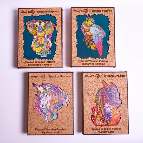 De Tovenaar Draak van Wood Trick is een geweldige aanwinst voor je puzzelcollectie. De doos bevat 184 levendige puzzelstukjes die ook nog eens de vorm hebben van 23 soorten sprookjesachtige dieren. Zo kunnen kinderen bij het maken van de puzzel hun eigen sprookjes verzinnen. Er zijn prinsen en prinsessen, tovenaars en ridders, centauren en andere mythische en sprookjesachtige wezens. Deze mooie Tovenaar Draak puzzel is gemaakt van milieuvriendelijk hout en hoogwaardige veilige verf. Het leuke van deze puzzel is dat de stukjes niet gebogen of gebroken kunnen worden, zodat je er heel lang van kunt genieten.
